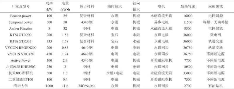 國外對于飛輪儲能的研究開展較早,我國起步較晚,始于二十世紀(jì)九十年代。飛輪儲能系統(tǒng)主要由轉(zhuǎn)子、支承系統(tǒng)、真空與冷卻系統(tǒng)、電機(jī)、儲能變流器(power convertion system,PCS)構(gòu)成,電機(jī)和PCS的選擇相對比較方便,基本上都有貨架產(chǎn)品,永磁電機(jī)、感應(yīng)電機(jī)均可使用,感應(yīng)電機(jī)技術(shù)成熟成本可控,是降低飛輪系統(tǒng)成本的首選,ABB、Emerson、Danfoss/Vacon等均有飛輪PCS出售。而轉(zhuǎn)子、支承系統(tǒng)、真空與冷卻系統(tǒng)的設(shè)計則千差萬別。根據(jù)公開資料整理出國內(nèi)外主要飛輪制造商和研究機(jī)構(gòu)的產(chǎn)品技術(shù)指標(biāo)如表1所示。