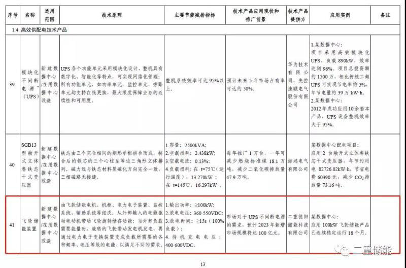 中國儲能網(wǎng)訊:近日,二重德陽儲能科技有限公司自主研制的飛輪儲能裝置成功入選工業(yè)和信息化部《綠色數(shù)據(jù)中心先進(jìn)實(shí)用技術(shù)產(chǎn)品目錄(2019年版)》。該《目錄》在全國范圍內(nèi)遴選產(chǎn)生,涉及能源、資源利用效率提升,可再生能源利用、分布式供能和微電網(wǎng)建設(shè),廢舊設(shè)備回收處理、限用物質(zhì)使用控制,綠色運(yùn)維管理等4個領(lǐng)域50項(xiàng)技術(shù)產(chǎn)品。