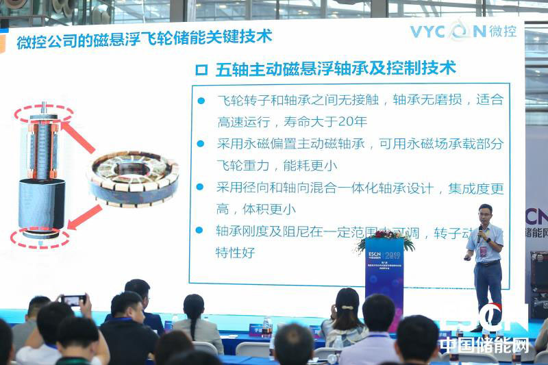 沈陽微控新能源技術(shù)有限公司物理儲能技術(shù)研究院院長江衛(wèi)良先生,于研討會首日做了題為《飛輪儲能技術(shù)在電力系統(tǒng)中的應(yīng)用》的主題報告。江衛(wèi)良院長在報告中介紹了飛輪儲能技術(shù)的基本原理與發(fā)展狀況,詳細介紹了微控新能源磁懸浮飛輪儲能產(chǎn)品的關(guān)鍵技術(shù)與產(chǎn)品,重點介紹了飛輪儲能技術(shù)在電力系統(tǒng)中的應(yīng)用,提出了混合儲能的創(chuàng)新解決方案。