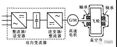 飛輪儲能裝置軸承的設(shè)計一般都使用非接觸式的磁懸浮軸承技術(shù),主要為了減少空閑運(yùn)轉(zhuǎn)時的損耗,提高飛輪的轉(zhuǎn)速以及飛輪儲能裝置的效率。同時電機(jī)和飛輪都被密封在一個真空容器內(nèi)以降低運(yùn)行時的空氣阻力。為了降低成本,也為了讓系統(tǒng)更加一體化,發(fā)電機(jī)和電動機(jī)通常公用一臺,通過軸承直接和飛輪連接在一起。由于飛輪的能量和轉(zhuǎn)速有關(guān),充放過程中也伴隨著變速,所以飛輪和電網(wǎng)之間還必須通過變流器來連接。