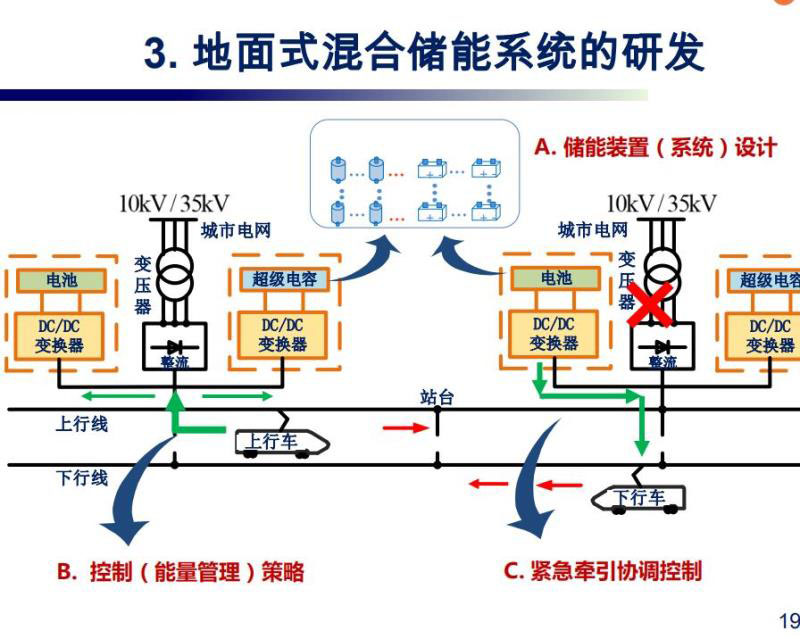 我們主要研究三個(gè)課題,一個(gè)是儲(chǔ)能裝置設(shè)計(jì)本身,包括超級(jí)電容和鈦酸鋰的容量應(yīng)該如何配置?第二個(gè)是能量管制策略;第三個(gè)緊急牽引時(shí)的協(xié)調(diào)控制問(wèn)題。