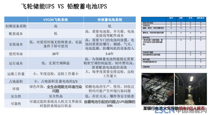 飛輪儲能和鉛酸電池,這是在一個UPS領(lǐng)域,比如說我們在一些區(qū)域中心,大家認(rèn)為鉛酸電池非常安全,其實(shí)不是這樣的,也會有事故,雖然比較少。比如說這個銀行做的UPS電源出現(xiàn)事故之后,導(dǎo)致經(jīng)濟(jì)損失2億人民幣,我們傳統(tǒng)的概念來說,我們都覺得鉛酸將近兩百年,實(shí)際情況是,根據(jù)統(tǒng)計(jì)學(xué)的方面得出結(jié)論,用飛輪儲能做UPS其實(shí)更好,目前很多醫(yī)院、機(jī)場,包括應(yīng)急電源都把飛輪儲能做UPS,國外大概有幾千套的應(yīng)用。