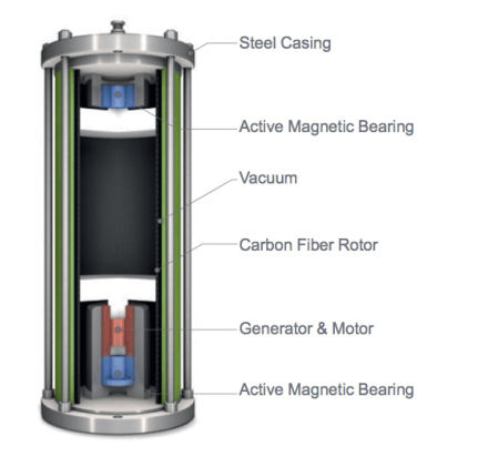 為儲(chǔ)能而開(kāi)發(fā)的設(shè)備安裝在一個(gè)真空外殼內(nèi),以減少空氣阻力。飛輪也使用連接到轉(zhuǎn)子的發(fā)電機(jī)進(jìn)行充電和放電。