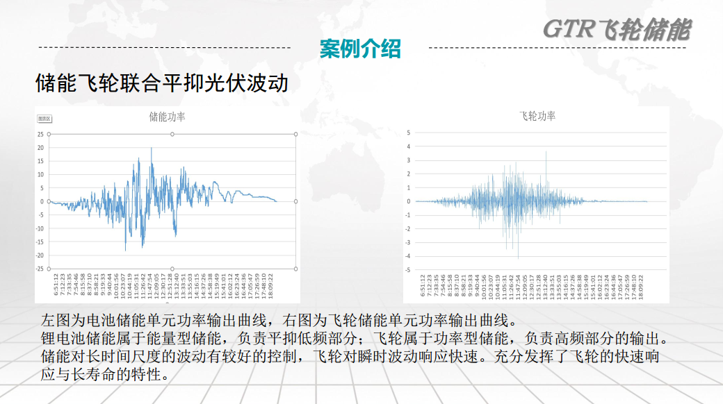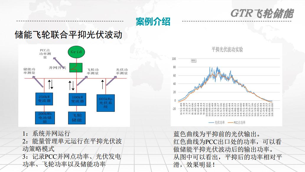 這個(gè)是我們做的一個(gè)功率均衡能力的一個(gè)試驗(yàn),在動(dòng)態(tài)和穩(wěn)態(tài)的情況下都可以有很好的均流。這是我們所做的一些實(shí)驗(yàn)項(xiàng)目,包括安全性檢驗(yàn)以及性能檢驗(yàn)方面。我們的應(yīng)用場景就是說一個(gè)是在傳統(tǒng)的火電廠輔助火電機(jī)組進(jìn)行一次調(diào)頻,采用這個(gè)飛輪加發(fā)電機(jī)組的形式。這樣有什么好處呢?就是可以輔助這個(gè)發(fā)電機(jī)組見效它的氣門開度時(shí)的機(jī)械損耗,還有能夠提升這個(gè)響應(yīng)速度。另外就針對(duì)分布式能源發(fā)電過程中的輸出功率波動(dòng)進(jìn)行補(bǔ)償抑制,見效分布式能源對(duì)電網(wǎng)功率的沖擊。在微電網(wǎng)可以平滑微網(wǎng)母線功率的波動(dòng),包括蓄電池的頻繁充放來減少它的次數(shù),另外是提高微電網(wǎng)電能質(zhì)量,頻率調(diào)節(jié)等等。另外一個(gè)領(lǐng)域就是軌道交通領(lǐng)域,一個(gè)是列車進(jìn)出站的再生制動(dòng)能量的回收應(yīng)用,還有就是節(jié)約牽引電能,減少飛輪磨損和暖通壓力。這是我們應(yīng)用的一些項(xiàng)目的案例,包括在微電網(wǎng)領(lǐng)域的英國的這兩個(gè)島嶼,還有我們國內(nèi)863的課題項(xiàng)目,還有地鐵公司和火電網(wǎng)的一次調(diào)頻項(xiàng)目。這是我們做的國家863課題計(jì)劃,這個(gè)是現(xiàn)場微電網(wǎng)的脫鋪結(jié)構(gòu)圖,整體加起來的話容量大概在1.5兆瓦。儲(chǔ)能平抑光伏波動(dòng)的控制策略就是利用飛輪的快速響應(yīng)來平緩這種瞬時(shí)的大功率波動(dòng)。右邊這個(gè)圖是實(shí)時(shí)的光伏的波動(dòng),紅色的是平抑之后的曲線,大家可以看出這個(gè)平抑后的功率相對(duì)平滑,效果較明顯。這個(gè)是儲(chǔ)能和飛輪輸出的一個(gè)功率的波形,咱們可以看到這個(gè)電池儲(chǔ)能是屬于能量型,飛輪屬于功率型,整體對(duì)這個(gè)光伏的波動(dòng)也有一個(gè)很好的平抑。