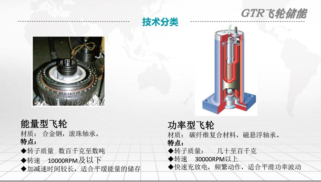 下面介紹一下國內(nèi)外的主要應(yīng)用,首先是有這種兆瓦級(jí)的飛輪電廠,為智能電網(wǎng)提供系統(tǒng)調(diào)頻服務(wù),提高電網(wǎng)的穩(wěn)定性。其次是利用這個(gè)飛輪頻繁充放大功率的特性,在軌道交通這種再生制動(dòng)能量的回收,牽引網(wǎng)壓支撐。還有夠是平抑光伏風(fēng)電波動(dòng),延遲蓄電池壽命、削峰填谷,調(diào)節(jié)電網(wǎng)母線頻率穩(wěn)定。還有一個(gè)是在這個(gè)UPS務(wù)領(lǐng)域這種不間斷電源,比如說助理這種柴油機(jī)啟動(dòng)。下面向大家匯報(bào)一下這個(gè)高功率GTR飛輪,我們這個(gè)飛輪的技術(shù)來源最初是來自于URENCO公司,是一家核工業(yè)技術(shù)公司。這是我們飛輪組成系統(tǒng)的剖面圖,這個(gè)地方是它的被動(dòng)磁軸承部分,這個(gè)地方是電機(jī)的定子,這個(gè)地方是轉(zhuǎn)子的外轉(zhuǎn)子結(jié)構(gòu),高速旋轉(zhuǎn)的轉(zhuǎn)子。核心技術(shù)主要是:第一,碳纖維復(fù)合材料轉(zhuǎn)子,這個(gè)是高強(qiáng)度、抗拉伸、MLC軟磁嵌入工藝。第二,被動(dòng)磁軸承,第三是高速永磁電機(jī)。GTR飛輪技術(shù)屬于高轉(zhuǎn)速小轉(zhuǎn)動(dòng)慣量大功率技術(shù)路線,這是我們裝置的一些簡單的參數(shù),高比功率是3000W/Kg,充放電頻率可以這樣理解,就是說可以在90秒時(shí)間內(nèi)可以完成15秒的充15秒的放,90秒的周期循環(huán)。還有就是超長的壽命,1千萬次大于20年循環(huán)壽命。這個(gè)地方介紹的是我們飛輪的一個(gè)簡單的工作邏輯,這個(gè)飛輪由靜止?fàn)顟B(tài)首先是一個(gè)加速,加速到30赫茲的時(shí)候會(huì)進(jìn)行一個(gè)自身損耗的測試,小于它的限定值的時(shí)候會(huì)再次加速。這是我們的一個(gè)能量管理單元,它可以協(xié)調(diào)控制多臺(tái)飛輪儲(chǔ)能裝置,比如說通過一鍵起動(dòng)、本地遠(yuǎn)程操作的方式,還有多個(gè)模塊的充放電能量均衡控制,還有SOC狀態(tài)監(jiān)控。還有它的故障日志,以及根據(jù)不同的應(yīng)用場景都可以來進(jìn)行調(diào)整的。