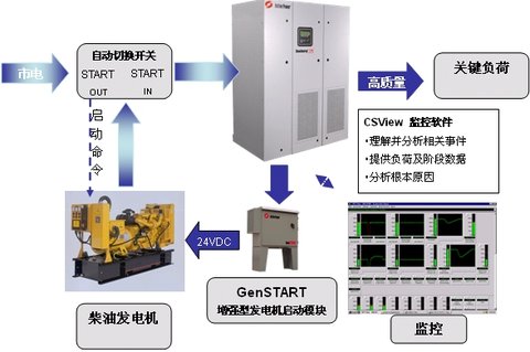 在圖3的免蓄電池磁懸浮飛輪儲能UPS電源系統(tǒng)工作連接框圖中可以看到,在UPS電源系統(tǒng)和柴油發(fā)電機(jī)之間有一個GenSTART產(chǎn)品(可選配置),叫做增強(qiáng)型發(fā)電機(jī)啟動模塊,它相當(dāng)于一個整流設(shè)備,從UPS電源系統(tǒng)獲得一個交流的能量,為柴油發(fā)電機(jī)提供高達(dá)1725安培(24VDC)的備份用的啟動電流,這樣與原有負(fù)責(zé)柴油發(fā)電機(jī)啟動的蓄電池組提供的啟動電流形成啟動電流1+1的冗余備份關(guān)系,因此提高了油機(jī)自動啟動的可靠性,從而大大提高了油機(jī)供電系統(tǒng)以及整個供電系統(tǒng)的可靠性和安全性。通過在UPS電源系統(tǒng)和柴油發(fā)電機(jī)之間加裝GenSTART產(chǎn)品,可以提高柴油發(fā)電機(jī)啟動成功率達(dá)到50倍。