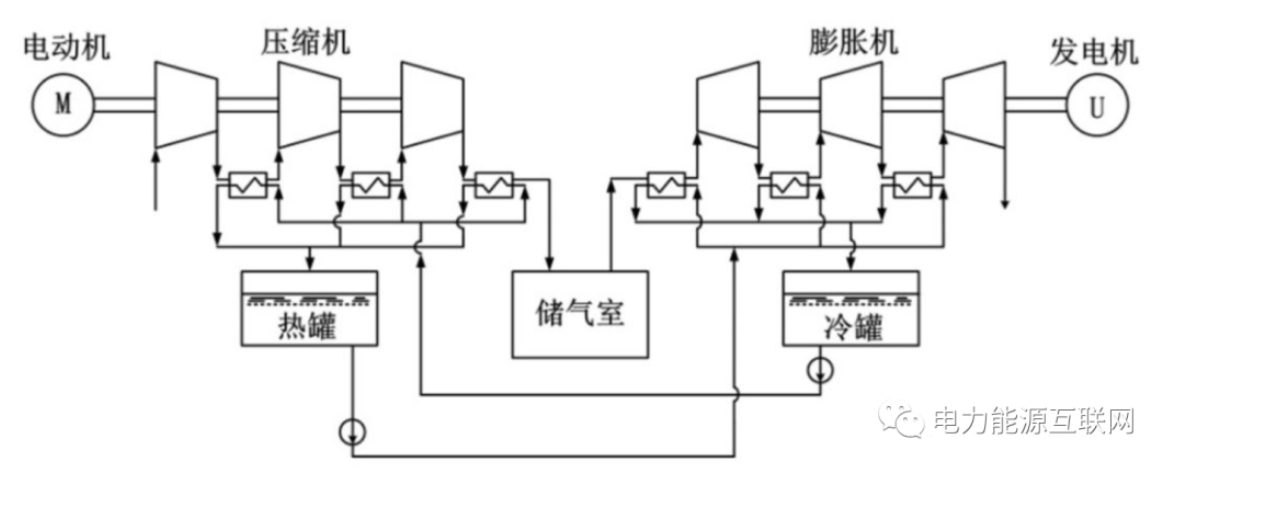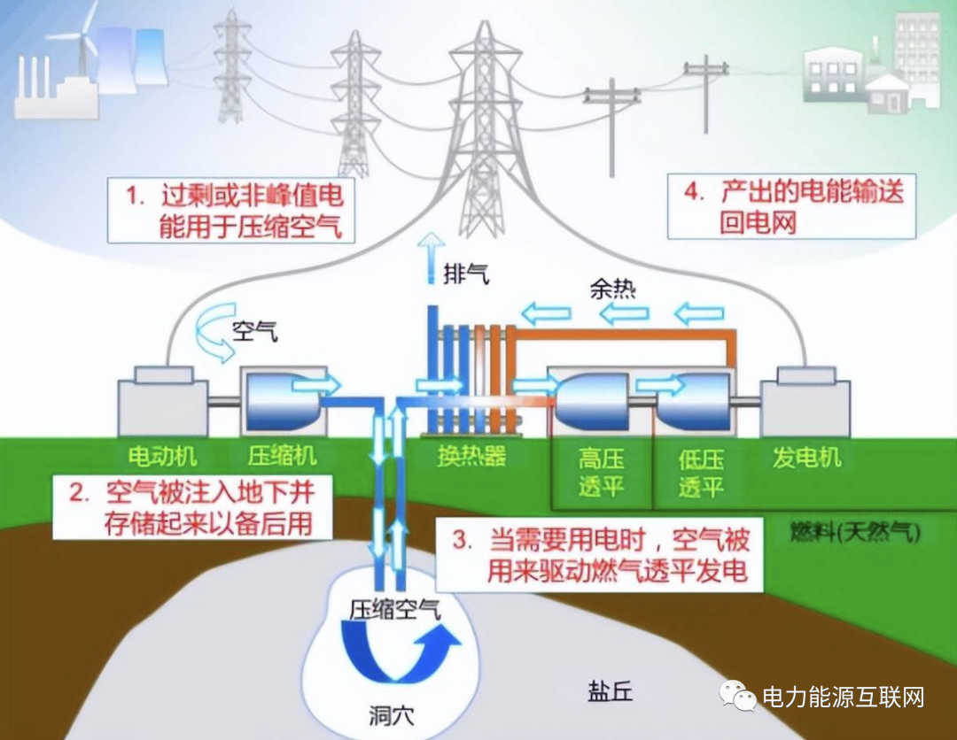 壓縮空氣儲能,是指在電網(wǎng)負(fù)荷低谷期將電能用于壓縮空氣,在電網(wǎng)負(fù)荷高峰期釋放壓縮空氣推動汽輪機(jī)發(fā)電的儲能方式。形式主要有,傳統(tǒng)壓縮空氣儲能系統(tǒng)、帶儲熱裝置的壓縮空氣儲能系統(tǒng)、液氣壓縮儲能系統(tǒng)。