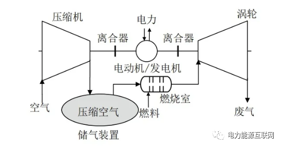 壓縮空氣儲能系統(tǒng)的壓縮機(jī)渦輪不同時工作),在儲能時,壓縮空氣儲能系統(tǒng)耗用電能將空氣壓縮并存于儲氣室中;在釋能時,高壓空氣從儲氣室釋放,進(jìn)入燃?xì)廨啓C(jī)燃燒室同燃料一起燃燒后,驅(qū)動渦輪發(fā)電。由于儲能、釋能分時工作,在釋能過程中,并沒有壓縮機(jī)消耗渦輪的輸出功。 因此,相比于消耗同樣燃料的燃?xì)廨啓C(jī)系統(tǒng),壓縮空氣儲能系統(tǒng)可以多產(chǎn)生1倍以上的電力。