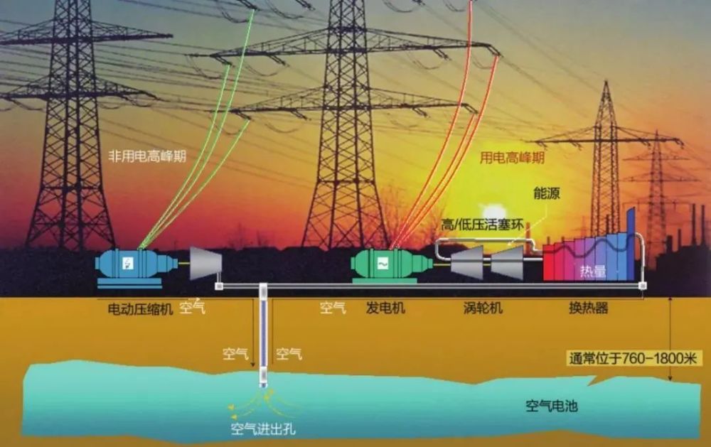 當(dāng)發(fā)電廠發(fā)的電用不了的時候,就可以通過壓縮機(jī)把電能傳遞給空氣電池,讓壓縮機(jī)不斷向地下輸送空氣,給地下的空氣加壓,這樣,發(fā)電廠多余的電能就不會浪費掉,儲存到空氣電池中。當(dāng)用電瘋狂的時候,把壓縮空氣放出來,氣流急速的沖擊力就可以帶動發(fā)電機(jī)發(fā)電,送往需要的用戶。