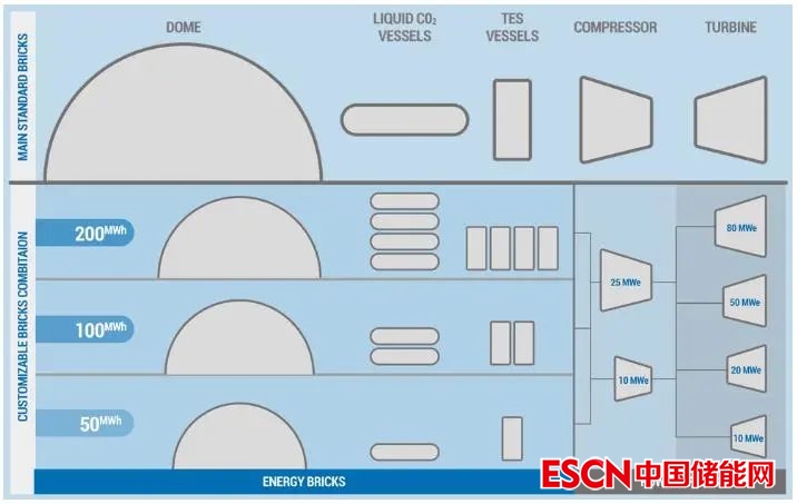 4)模塊化系統(tǒng)。二氧化碳儲能系統(tǒng)將是模塊化的,可以根據(jù)需要擴展到任何尺寸。液態(tài)二氧化碳容器、壓縮機、渦輪機均有不同尺寸,使用者可以根據(jù)需要,以最合適的充電或放電率來優(yōu)化設計。