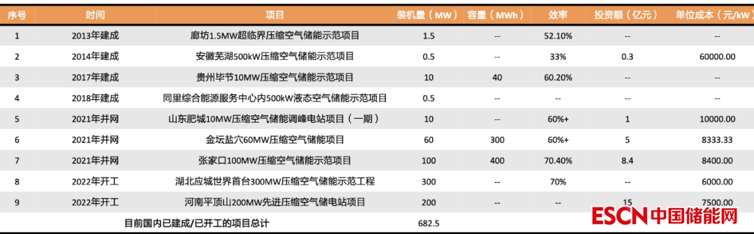 已建成/已開(kāi)工的九個(gè)項(xiàng)目分別是:安徽蕪湖500kW壓縮空氣儲(chǔ)能示范項(xiàng)目、貴州畢節(jié)10MW壓縮空氣儲(chǔ)能示范項(xiàng)目、同里綜合能源服務(wù)中心內(nèi)500kW液態(tài)空氣儲(chǔ)能示范項(xiàng)目、山東肥城10MW壓縮空氣儲(chǔ)能調(diào)峰電站項(xiàng)目(一期)、金壇鹽穴60MW壓縮空氣儲(chǔ)能項(xiàng)目、張家口100MW壓縮空氣儲(chǔ)能示范項(xiàng)目、湖北應(yīng)城世界首臺(tái)300MW壓縮空氣儲(chǔ)能示范工程、河南平頂山200MW先進(jìn)壓縮空氣儲(chǔ)電站項(xiàng)目、廊坊1.5MW超臨界壓縮空氣儲(chǔ)能示范項(xiàng)目。