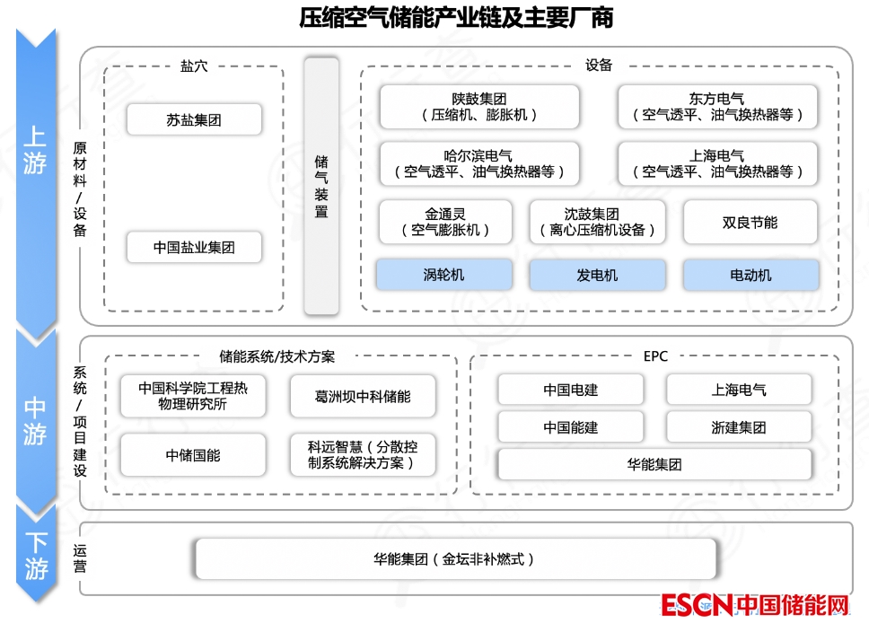壓縮空氣儲(chǔ)能產(chǎn)業(yè)鏈包括上游裝備制造、儲(chǔ)氣庫(kù);中游儲(chǔ)能系統(tǒng)集成(主要提供技術(shù)支持);下游儲(chǔ)能系統(tǒng)安裝為新能源及傳統(tǒng)電站、電網(wǎng)公司、工商業(yè)企業(yè)等終端用戶(hù)提供EPC(工程建設(shè)總承包)業(yè)務(wù)。