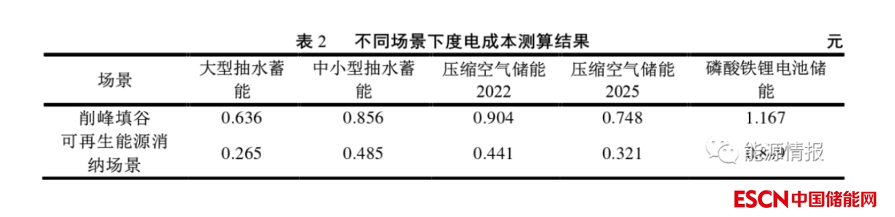在削峰填谷和電源側(cè)可再生能源消納(利用新能源基地棄風棄光充電,不考慮充電成本)2種場景下,采用平準化電力成本方法分析比較了不同的儲能技術(shù)的全壽命期度電成本,考慮了工程建設(shè)成本、運維成本、儲能成本,對比抽水蓄能、中小型抽水蓄能、壓縮空氣儲能2022(現(xiàn)水平)和2025(“十四五”末發(fā)展水平)、電化學儲能5種儲能形式,初步測算成果見表2。