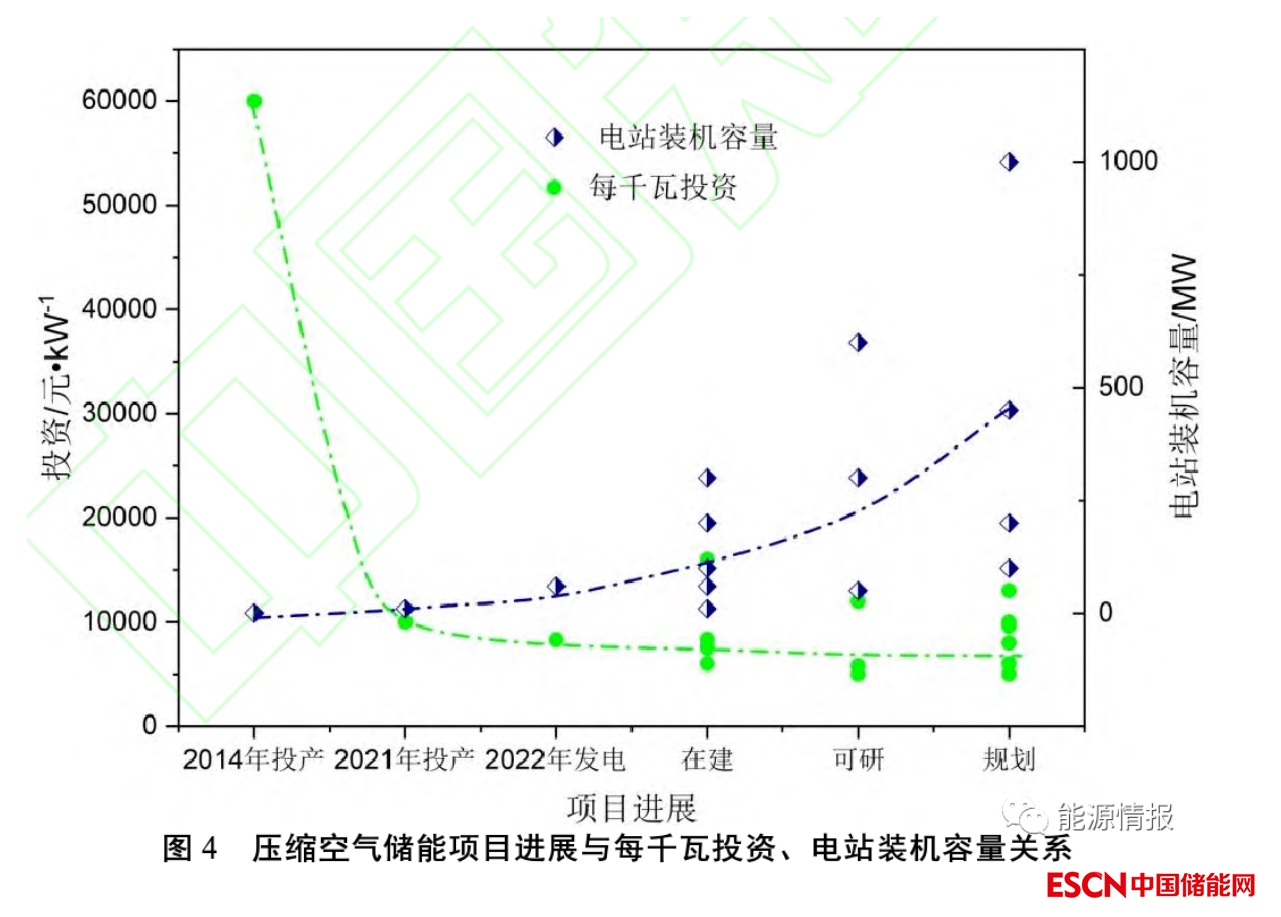 壓縮空氣儲能項目進展與每千瓦投資、項目裝機容量關(guān)系見圖4。從圖4可知,壓縮空氣儲能電站的機組容量隨著技術(shù)迭代更新正逐步增大,每千瓦投資在逐步減少,相應的期建設(shè)成本仍處于下降過程中。如國內(nèi)第1個投運的非補燃壓縮空氣示范項目蕪湖電站裝機500kW,其投資約60000元/kW;肥城一期電站裝機10MW,其投資約10000元/kW;金壇項目和目前正在建設(shè)的張北、云崗井田項目投資約8000元/kW,已與中小型抽水蓄能建設(shè)成本相當;部分可研階段和規(guī)劃階段的壓縮空氣儲能項目,估算投資約5000~6000元/kW,已與大型抽水蓄能電站相當。