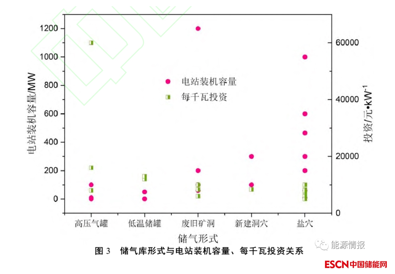 壓縮空氣儲能儲氣庫包括高壓氣罐、低溫儲罐、廢舊礦洞、新建洞穴、鹽穴等多種形式。儲氣庫形式與機組容量、每千瓦投資關(guān)系見圖3。圖3中,機組容量為電站總裝機容量,400~1200MW容量一般裝機2~4臺。對我國規(guī)劃、可研、在建、已建項目的統(tǒng)計分析可知,鹽穴儲氣庫機組容量多較大,其每千瓦投資相對較低;廢舊礦洞和新建洞穴也多可用作大型電站建設(shè),每千瓦投資稍高于鹽穴建庫;而低溫儲罐和高壓氣罐一般用于中小型電站,且多處于試驗階段,現(xiàn)階段其每千瓦平均投資普遍比地下儲氣庫高。由于大型壓縮空氣儲能電站需要較大的儲氣空間,而地上儲氣罐(管)價格昂貴,現(xiàn)階段在建、已投產(chǎn)項目多采用地下儲氣庫,即鹽穴、新建洞穴和礦洞改造3種形式。本文就此3種形式的儲氣庫做重點論述。
