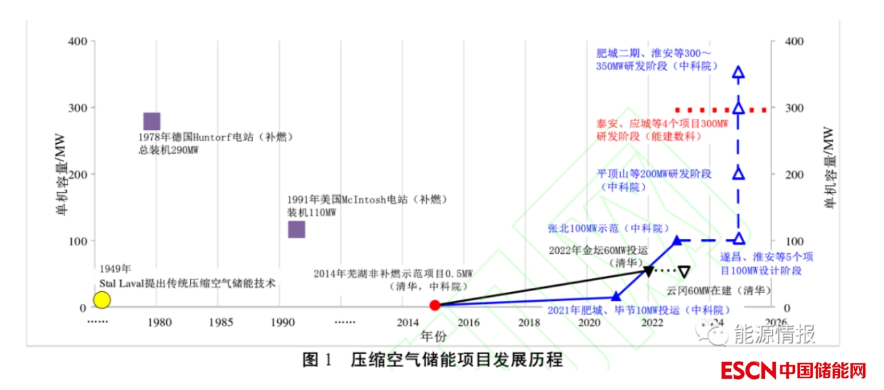 此外,肥城(二期)300MW級壓縮空氣儲能電站和中國能建數(shù)科集團的平頂山(200MW)、泰安(300MW)等項目近期完成了可行性研究。當前,100MW級壓縮空氣儲能項目正在開展示范應用。規(guī)劃或設(shè)計階段的一大批壓縮空氣儲能項目,裝機規(guī)模逐步由100MW發(fā)展到200MW或300MW。壓縮空氣儲能技術(shù)正由示范應用階段,轉(zhuǎn)向初期商業(yè)化發(fā)展階段。壓縮空氣儲能項目發(fā)展歷程見圖1。