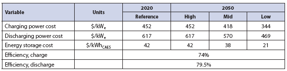 盡管如此,可以開發(fā)出高、中、低成本的估算值,并與報告的數(shù)字進(jìn)行比較。例如,天然氣發(fā)電廠和熱儲能系統(tǒng)的成本信息可用于分別估算CAES系統(tǒng)電力和能源容量的參考成本。由于CAES系統(tǒng)的地上部件(如壓縮機、膨脹機和熱交換器)技術(shù)成熟,它們的成本可以給定的工廠進(jìn)行估計??梢允褂脕碜跃酃馓柲軕?yīng)用的數(shù)據(jù)以一定的準(zhǔn)確度估算低溫和中溫蓄熱的成本。高溫儲存(600℃以上)的成本更不確定。大部分剩余的不確定性CAES成本來自空氣儲能成本的不確定性。