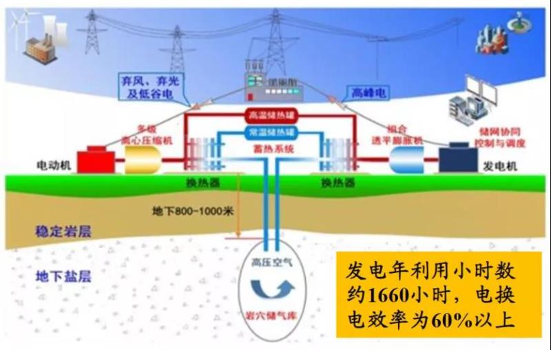 項(xiàng)目在電網(wǎng)負(fù)荷低谷期使用電能,將空氣高壓密封在地下1000米的鹽穴中,待電網(wǎng)負(fù)荷高峰期釋放壓縮空氣推動(dòng)汽輪機(jī)發(fā)電。此外,該技術(shù)還將壓縮空氣時(shí)產(chǎn)生的熱能收集和存儲(chǔ)起來,待釋能時(shí)用來加熱進(jìn)入膨脹機(jī)做功的空氣,將電能轉(zhuǎn)換效率提升至60%以上,全過程無燃燒、無排放。