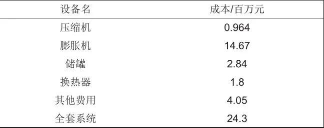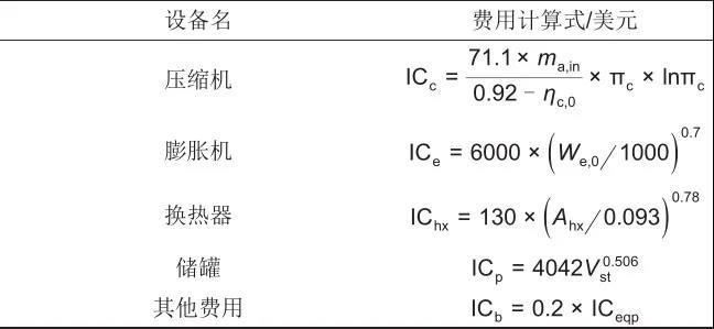 式中,IC為系統(tǒng)內(nèi)各設(shè)備的成本,成本計算式見表3,由于水循環(huán)的設(shè)備成本較低,因此本文僅考慮壓縮機、膨脹機、儲罐以及換熱器的成本,其他費用如安裝費用、工程建設(shè)費用、預(yù)備費等按照系統(tǒng)設(shè)備總費用的20%估算。
