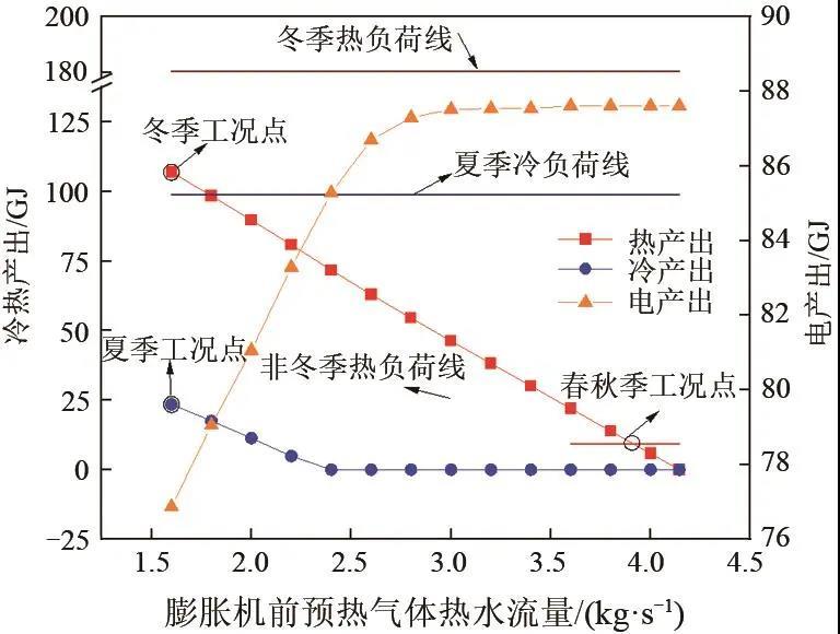 由圖4的小區(qū)冷熱電負荷分時變化可得660戶的小區(qū)單日冷負荷為98.8 GJ;冬季單日熱負荷為180.5 GJ,非冬季單日熱負荷為9.4 GJ;全季節(jié)單日電負荷為57.74 GJ。由系統(tǒng)輸出特性圖6可知,所有工況點電量產(chǎn)出均大于57.74 GJ,現(xiàn)需根據(jù)不同季節(jié)的單日冷熱負荷,匹配滿足冷熱負荷的膨脹機前預(yù)熱換熱器的熱水流量,預(yù)熱熱水流量的選取原則為:在滿足冷熱需求的前提下,盡可能提高電量產(chǎn)出以實現(xiàn)收益最大化。