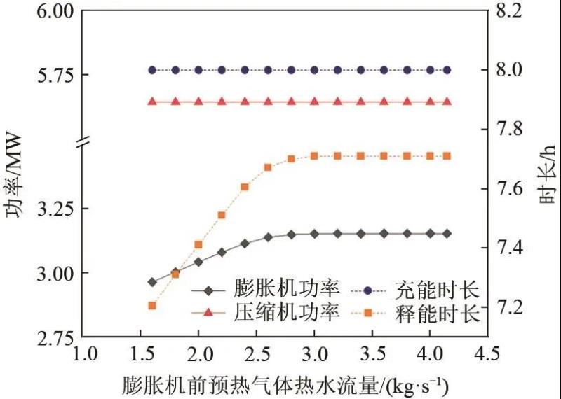 為進一步解釋冷熱電產(chǎn)量隨預(yù)熱熱水流量的變化規(guī)律,圖7給出了系統(tǒng)在不同預(yù)熱熱水流量下的充能階段和釋能階段的功率以及時長。壓縮機組功率恒定為5.64 MW,充能時長恒定為8 h,因為自變量僅影響釋能階段氣體的溫度,對充能階段無影響。隨著預(yù)熱熱水流量自1.6 kg/s升至4.144 kg/s,釋能階段膨脹機組功率自2.96 MW升至3.15 MW,而釋能階段的時長自7.2 h上升至7.7 h。釋能時長上升的原因是氣體溫度上升導(dǎo)致密度下降,隨之氣體質(zhì)量流量下降,釋能時間延長。氣體溫度上升的過程中,氣體通過膨脹機的焓變增大,且氣溫更接近膨脹機額定工作溫度,膨脹機輸出功率上升。釋能時間與膨脹機功率均上升,因此輸出的總電量上升。隨著釋能時長的上升以及本身預(yù)熱熱水流量的上升,用于供給用戶的熱量即呈現(xiàn)下降趨勢。冷凍水溫度隨著氣體溫度的上升而下降,冷凍水溫度是決定冷量大小的主要因素,釋能時長的小幅度增長對冷量產(chǎn)出影響不大。