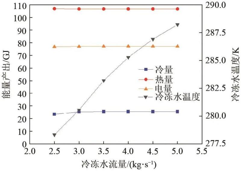 圖5 不同冷凍水流量下的冷熱電量產(chǎn)出和冷凍水溫度