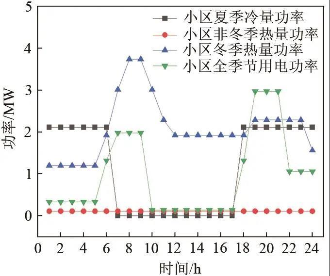 居民生活小區(qū)是對冷熱電均有需求的典型供能對象。張鐵峰等調(diào)研了小區(qū)單個住戶的各類電器的用電特性,并以此建立家庭住戶工作日用電的負荷模型,模型顯示:住戶的工作日用電特性為早晚為用電峰值,夜晚與工作時段為用電低谷。空調(diào)用電不同時段差異明顯。王連國調(diào)研了山東某住宅小區(qū)的供熱特性,給出了住房單位面積的熱負荷實時變化模型,模型顯示,住宅熱負荷在夜間為谷值,在早晨為峰值,其余時段為平值。朱仁洪等調(diào)研了不同面積的住宅在工作日與非工作日的實時冷量負荷,結(jié)果顯示,無論是否為工作日,住戶冷量負荷特征均為夜間和傍晚負荷大,白天負荷較小,但非工作日白天冷負荷高于工作日的冷負荷。
