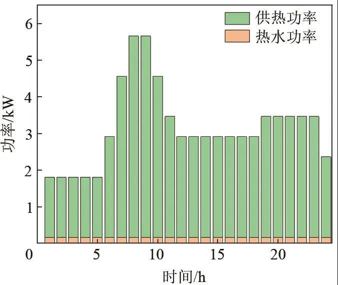 圖2為一戶住宅單日用電負荷的簡化模型,柱狀圖中綠色部分為空調(diào)用電,黃色部分為除空調(diào)以外的電器用電,假定夏季與非夏季用電特性的區(qū)別僅在于是否有空調(diào)用電,則黃色部分為非夏季住戶的用電功率變化,而疊加后的柱狀圖為夏季住戶的用電功率變化。小區(qū)的冷量需求是根據(jù)空調(diào)用電反推而得:根據(jù)圖2給出的空調(diào)用電需求,并假定空調(diào)能效比為3.2,可得住宅單日冷量需求為0.15 GJ。小區(qū)熱量供應(yīng)分為2個部分:冬季供暖和全季節(jié)恒定供生活熱水。冬季供暖熱量為一戶單日消耗0.2592 GJ。全季節(jié)單人單日恒定熱水供應(yīng)為50 L,溫度為50 ℃,假設(shè)該熱水加熱前溫度為環(huán)境溫度即300 K,供熱前后熱水溫差較小,取平均定壓比熱容為4.181 kJ/(kg·K),則單人單日熱量負荷為0.00475 GJ,假定一戶3人,則一戶單日消耗熱水的熱量為0.01425 GJ。圖3為住宅單日熱量負荷模型,圖中橙色部分為固定的熱水需求,綠色部分為實時供暖負荷,冬季單日熱量負荷為兩者之和即0.273 GJ,非冬季只有熱水的熱負荷為0.01425 GJ。整合上述單一負荷的模型,可得整個小區(qū)的不同季節(jié)的冷熱電負荷分時變化如圖4所示,圖中用電負荷未區(qū)分夏季與非夏季,這是因為空調(diào)耗電已經(jīng)換算為冷量負荷,不應(yīng)再納入電力負荷部分。