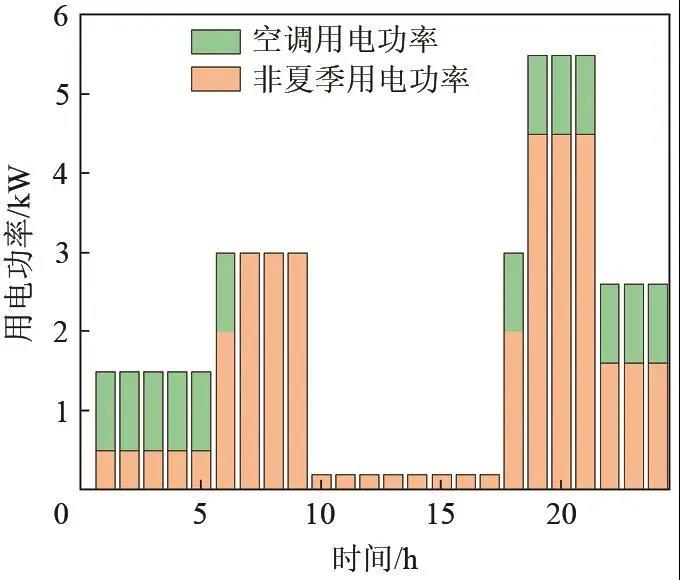 本文中冷熱電供應(yīng)對象為一個含660戶住戶的小區(qū)。假定每戶人口數(shù)為3人,住宅面積為100 m2。住宅電力負荷特性在夏季和非夏季的區(qū)別在于夏季有空調(diào)用電,夏季與非夏季電負荷變化趨勢類似,早晨與凌晨前晚上為用電高峰,而凌晨后至清晨以及10:00—17:00點的工作時段為用電低谷,為典型的工作日用電規(guī)律;住戶冷負荷只存在于夏季,由空調(diào)用電按照空調(diào)能效比計算得到;住宅熱負荷分冬季的供暖熱負荷和四季的日常用熱水的熱負荷,因此冬季熱負荷大于其他季節(jié)的熱負荷。