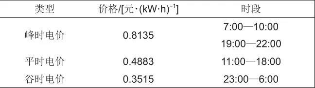 值得注意的是,壓縮過程產(chǎn)熱部分用于釋能階段預(yù)熱膨脹空氣不計入熱量價值,供給用戶的熱量才計入熱量價值中。式中,Qheat為壓縮熱量;Qcool為冷量;Qpreheat為預(yù)熱氣體熱量;Cpeak為峰值電價;Cvalley為谷值電價;Cheat為參考中小型燃煤鍋爐的熱量價格;Ccool為冷量價格,該價格為結(jié)合空調(diào)實時用電價格以及假定空調(diào)能效比為3.2計算而得。這些能量價格分別為225.97元/GJ、97.64元/GJ、43.76元/GJ、29.233元/GJ。峰谷電價的運行時段見表2。