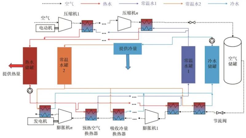 本文采用如下一些運行設(shè)定及假設(shè):①系統(tǒng)使用了5個儲罐,分別為儲存壓縮氣體的儲氣罐、儲存壓縮階段產(chǎn)熱的熱水保溫水罐、儲存膨脹階段產(chǎn)冷的冷水保溫水罐以及分別供完冷熱之后的回收水罐;②系統(tǒng)產(chǎn)熱一部分用于釋能階段預(yù)熱膨脹氣體,其余全部供給用戶,系統(tǒng)產(chǎn)冷全部供給用戶,充當儲熱與儲冷介質(zhì)的水每次循環(huán)時的初始溫度為環(huán)境溫度;③不同級數(shù)的壓縮機壓縮比相同,膨脹機也是如此。