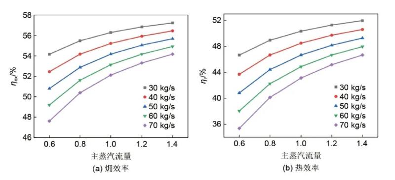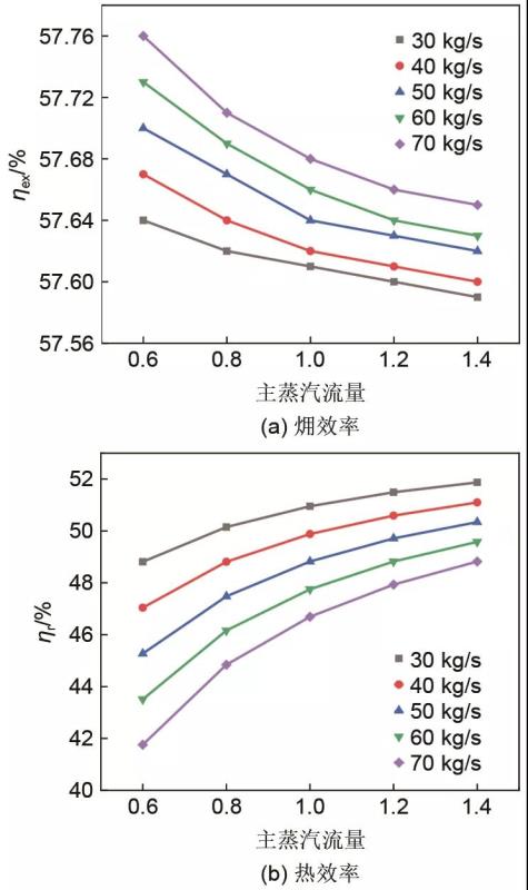 圖14 抽汽量不同時(shí)總過程?效率和熱效率變化規(guī)律