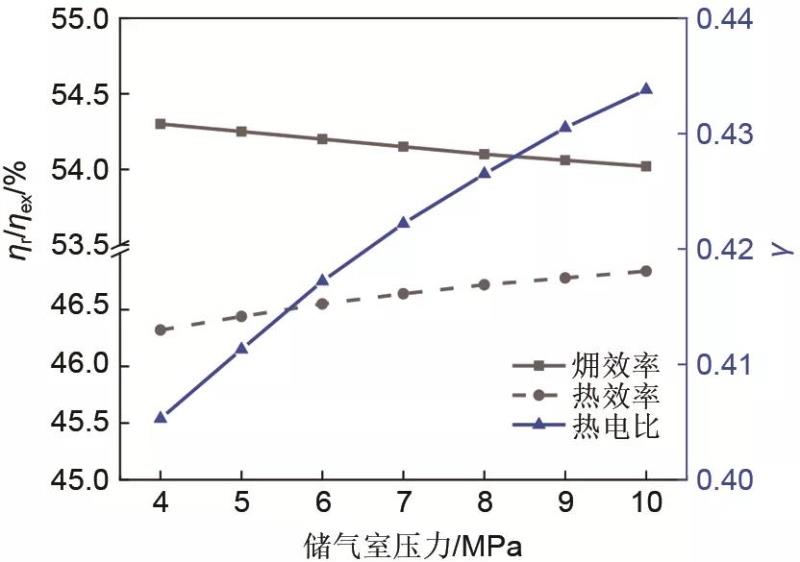 圖9為儲(chǔ)氣室壓力對(duì)集成系統(tǒng)熱效率、?效率和熱電比的影響,可以看出儲(chǔ)氣室壓力對(duì)各性能參數(shù)的影響較小。當(dāng)儲(chǔ)氣室壓力從4 MPa增大到10 MPa時(shí),集成系統(tǒng)總過程的?效率降低0.3%,這是因?yàn)殡S著儲(chǔ)氣室壓力增大,壓縮機(jī)耗功隨之增大,電能向熱能和壓力勢(shì)能轉(zhuǎn)換時(shí)的損失也略有增大,導(dǎo)致?效率呈現(xiàn)減小趨勢(shì);而熱效率增大0.5%,是因?yàn)殡S著壓縮機(jī)背壓的增大,壓縮機(jī)出口空氣溫度升高明顯,導(dǎo)致總系統(tǒng)向外輸出的熱能增大,但系統(tǒng)的輸入變化并不明顯,所以集成系統(tǒng)總過程的熱效率隨著儲(chǔ)氣室壓力的增大而增大;集成系統(tǒng)總過程熱電比增大0.03,隨著儲(chǔ)氣室壓力增大,能量轉(zhuǎn)換過程中的損失增大導(dǎo)致集成系統(tǒng)總過程的凈輸出電能逐漸減小,而強(qiáng)化供熱過程輸出的熱能逐漸增大,所以集成系統(tǒng)總過程的熱電比呈現(xiàn)增大趨勢(shì)。