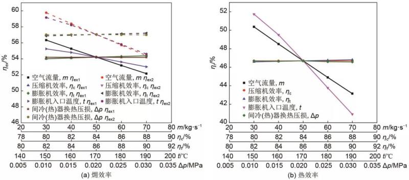 (1)強(qiáng)化供熱階段,壓縮空氣儲(chǔ)能系統(tǒng)的空氣流量對(duì)集成系統(tǒng)的熱效率/?效率影響最明顯,當(dāng)空氣流量從30 kg/s增加到70 kg/s時(shí),熱效率和?效率均變化3%左右;強(qiáng)化供電階段,膨脹機(jī)入口空氣溫度的影響最大,當(dāng)入口溫度從150 ℃增加至190 ℃時(shí),熱效率變化10%左右,?效率變化2%左右。壓縮空氣儲(chǔ)能系統(tǒng)的壓縮機(jī)/膨脹機(jī)效率以及換熱器性能對(duì)集成系統(tǒng)各效率影響均較?。?