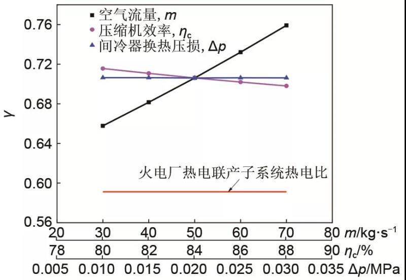 由圖5中可以看出,隨著進(jìn)入壓縮機(jī)和膨脹機(jī)的空氣流量的增加,集成系統(tǒng)強(qiáng)化供熱階段的熱電比逐漸增加,空氣流量從30 kg/s增加到70 kg/s時(shí),熱電比從0.6578增長(zhǎng)到0.7592;這是因?yàn)樵龃罂諝饬髁繒r(shí),產(chǎn)生的壓縮熱隨之增大,間冷器可以收集到的熱量增多,可向用戶提供的熱量也逐步增加,所以熱電比的變化逐步增加且增幅明顯。當(dāng)壓縮機(jī)效率從0.82向0.90增大時(shí),集成系統(tǒng)強(qiáng)化供熱階段熱電比略有減??;原因是當(dāng)壓縮機(jī)效率升高時(shí),產(chǎn)生的壓縮熱有所減小,可收集的提供給用戶的熱量減小,導(dǎo)致熱電比輕微降低。當(dāng)間冷器兩端的換熱壓損從0.01 MPa增加到0.03 MPa時(shí),換熱損失有所增加,從而導(dǎo)致熱電比有輕微下降。