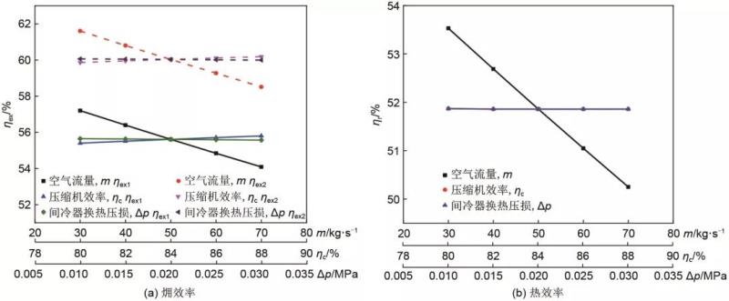 (3)總過程。從圖8中可以看出,由于換熱站換熱溫度不對(duì)等引起的換熱?損失,ηex1比ηex2小3%左右,采暖抽汽與用戶采暖溫度的差值會(huì)造成較大的能量損失。隨著進(jìn)入壓縮空氣儲(chǔ)能子系統(tǒng)壓縮機(jī)和膨脹機(jī)的空氣流量的增加,集成系統(tǒng)總過程的?效率呈現(xiàn)逐步減小的趨勢(shì),當(dāng)空氣流量從30 kg/s增加到70 kg/s時(shí),總過程的?效率從56.3%減小到52.2%;熱效率從50.4%減小至43.2%。這是因?yàn)殡S著空氣流量的增加,有更多的電能完成從電能到熱能再到電能的轉(zhuǎn)化,即能量品位從高到低再到高,造成了能量的浪費(fèi),所以總過程?效率和熱效率呈現(xiàn)減小趨勢(shì)。當(dāng)壓縮空氣儲(chǔ)能子系統(tǒng)的壓縮機(jī)效率從0.82增加到0.90時(shí),總過程?效率增加0.4%;熱效率幾乎不變。這是由于當(dāng)壓縮機(jī)效率提高時(shí),壓縮機(jī)的耗功會(huì)相應(yīng)降低,即高品位的電能向低品位的熱能轉(zhuǎn)化的量減少,從而導(dǎo)致總過程?效率增加。當(dāng)壓縮空氣儲(chǔ)能子系統(tǒng)的膨脹機(jī)效率從0.84增加到0.92時(shí),總過程的?效率增加0.35%,熱效率增加0.2%。原因是膨脹機(jī)效率的提高,會(huì)有更多的熱能轉(zhuǎn)化為電能,能量品位得以提升,故總過程的?效率和熱效率呈現(xiàn)增加態(tài)勢(shì)。膨脹機(jī)入口溫度從150 ℃增加至190 ℃時(shí),總過程?效率降低2.2%;當(dāng)改變間冷器和再熱器兩端的換熱壓損使其從0.01 MPa增加到0.03 MPa時(shí),總過程?效率在54.2%左右,熱效率在46.6%左右;這是因?yàn)閾Q熱損失隨之增加,但由于其影響較小,故總過程的?效率輕微減小,幾乎沒有影響。