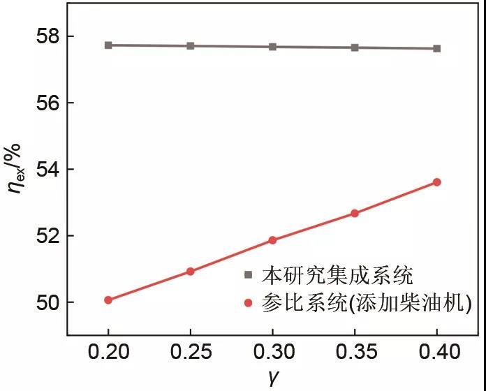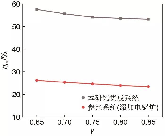 在計(jì)算壓縮空氣儲(chǔ)能子系統(tǒng)各部件參數(shù)對(duì)新型集成系統(tǒng)?效率的影響時(shí),為對(duì)比由于換熱站換熱溫度不對(duì)等導(dǎo)致的換熱?損失大小,進(jìn)行了兩個(gè)不同?效率的計(jì)算,區(qū)別在于一個(gè)采用用戶側(cè)采暖供回水的?值差做為輸出熱負(fù)荷?值,取為ηex1;另一個(gè)采用采暖抽汽供回的?值差做為輸出熱負(fù)荷?值,取為ηex2。
