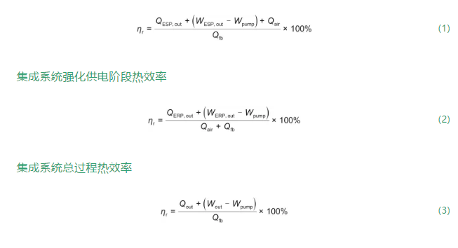 式中,QESP,out為集成系統(tǒng)強(qiáng)化供熱階段的輸出熱負(fù)荷,W;WESP,out為集成系統(tǒng)強(qiáng)化供熱階段的輸出功率,W;Wpump為泵附件耗功熱值,W;QERP,out為集成系統(tǒng)強(qiáng)化供電階段的輸出熱負(fù)荷,W;WERP,out為集成系統(tǒng)強(qiáng)化供電階段的輸出功率,W。