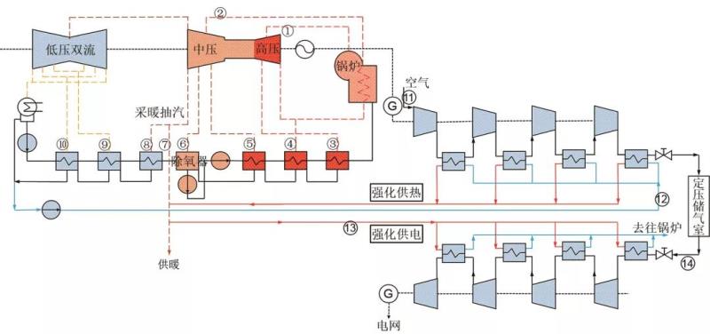 本文提出一種熱電聯(lián)產(chǎn)機(jī)組與壓縮空氣儲(chǔ)能集成的新系統(tǒng),即在壓縮空氣儲(chǔ)能系統(tǒng)的基礎(chǔ)上,利用壓縮過程產(chǎn)生的壓縮熱來(lái)提供熱負(fù)荷,并引入熱電聯(lián)產(chǎn)機(jī)組汽輪機(jī)中壓缸末級(jí)采暖抽汽來(lái)加熱膨脹機(jī)入口空氣,以實(shí)現(xiàn)能源的高效利用。其中,熱電聯(lián)產(chǎn)機(jī)組采用中間再熱抽凝式機(jī)組,回?zé)岢槠?jí)數(shù)采用三高三低一除氧;壓縮空氣儲(chǔ)能系統(tǒng)采用四級(jí)壓縮和四級(jí)膨脹,為定壓壓縮空氣儲(chǔ)能系統(tǒng)形式,利用水的靜壓實(shí)現(xiàn)儲(chǔ)氣室壓力的恒定。圖1為該新型熱電聯(lián)供系統(tǒng)流程。