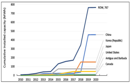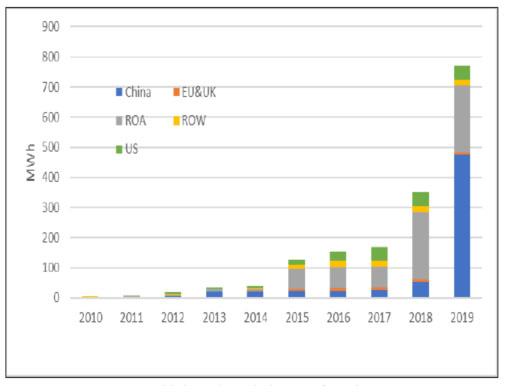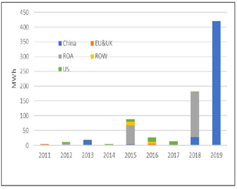 圖39. 全球各地的液流電池(RFB)年度累計(jì)部署(2010~2019年)