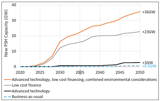 圖33.美國抽水蓄能設(shè)施部署模型ReEDS:技術(shù)改進(jìn)和融資增加
