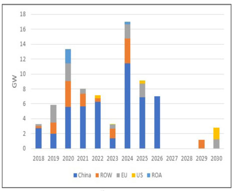 中國近期計(jì)劃部署的抽水蓄能設(shè)施裝機(jī)容量最高。從2020年至2026年,預(yù)計(jì)中國將部署35GW以上的抽水蓄能設(shè)施,都是規(guī)模非常大的水電站。例如,中國計(jì)劃年投資28億美元建設(shè)的豐寧縣水電站的裝機(jī)容量為3.5GW。而在澳大利亞,Genex 電力公司最近與Energy Australia公司簽定了一個(gè)裝機(jī)容量250MW抽水蓄能設(shè)施合同。
