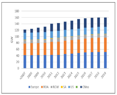 抽水蓄能是歷史最悠久的儲(chǔ)能技術(shù)之一。實(shí)際上,最早運(yùn)行的一個(gè)抽水蓄能電站(PSH)是1909年在瑞士開通運(yùn)營的。全球抽水蓄能電站(PSH)的累積部署如圖29所示,到2019年的裝機(jī)容量增長到160GW。如今,大部分抽水蓄能設(shè)施在歐洲和亞洲運(yùn)營。盡管抽水蓄能電站(PSH)的裝機(jī)容量非常高,但應(yīng)該注意的是,并不是所有的抽水蓄能設(shè)施(PSH)都能應(yīng)對(duì)當(dāng)今電網(wǎng)面臨的挑戰(zhàn)。