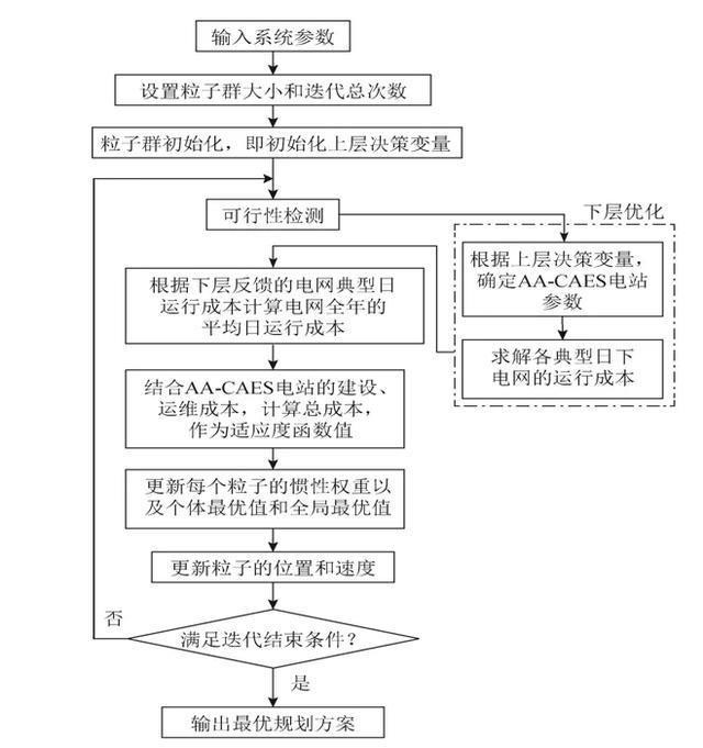 在此基礎(chǔ)上,建立了AA-CAES電站雙層優(yōu)化規(guī)劃模型,上層計(jì)及AA-CAES電站壽命對(duì)其日均投資成本的影響,對(duì)AA-CAES電站的投資、運(yùn)行維護(hù)成本與下層反饋的電網(wǎng)典型日運(yùn)行成本之和進(jìn)行優(yōu)化;下層根據(jù)上層所確定的AA-CAES電站容量,進(jìn)行電網(wǎng)典型日最優(yōu)運(yùn)行方式求解,并將最優(yōu)運(yùn)行結(jié)果反饋給上層。