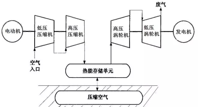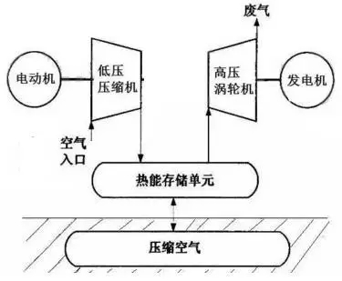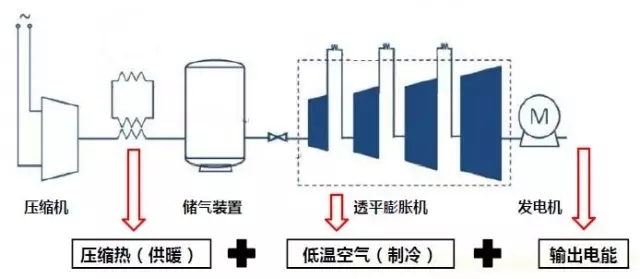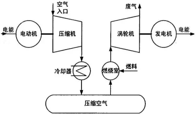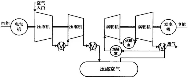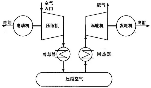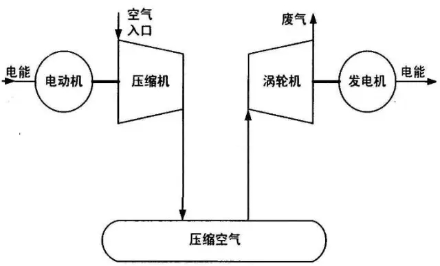 壓縮空氣的基本原理很簡單,在電網(wǎng)負荷低谷期將電能用于壓縮空氣,將空氣高壓密封在報廢礦井、儲氣罐、山洞、過期油氣井或新建儲氣井中,在電網(wǎng)負荷高峰期釋放壓縮空氣推動汽輪機發(fā)電的儲能方式,原理如下圖所示。若需要更近一步解釋,你只需鎖定儲氣罐內(nèi)的空氣即可,兩個動作,充氣時儲存能量,膨脹時釋放能量。