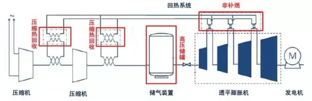 相較于原理型系統(tǒng),回?zé)嵯到y(tǒng)儲電效率有所增加,然而它的不足在于,冷卻器和回?zé)崞鞣珠_設(shè)置,在熱量回收過程中存在較大熱損失。為解決這一問題,有人提出絕熱壓縮空氣系統(tǒng),變異2,參照下圖。將壓縮過程中產(chǎn)生的熱量存儲起來,然后在發(fā)電過程中用這部分熱量預(yù)熱壓縮空氣,冷卻器和回?zé)崞骱蠟橐惑w,對外進行絕熱處理,業(yè)內(nèi)稱作先進絕熱壓縮空氣儲能系統(tǒng)(AA-CAES),該系統(tǒng)面臨的最大挑戰(zhàn)是如何經(jīng)濟、有效地設(shè)計和制造出壓力工作范圍大的壓縮機、渦輪機和除熱器。