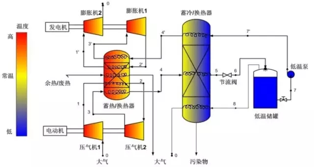 壓空系統(tǒng)的技術(shù)痛點在于氣體的密度太低,常壓下空氣密度為1.25kg/m3,即使在10Mpa高壓下密度也只有100kg/m3左右,相比水的1000kg/m3,差了足足十倍,這意味在相同儲存質(zhì)量下,空氣的罐子要比水大十倍。要解決大規(guī)??諝獯鎯Φ姆椒ㄖ辽儆?個,方法一,就地取材,尋找廢棄的礦井,進行密封承壓方面的改造,然后將空氣壓入其中,這種方法既經(jīng)濟又可靠,而且儲量驚人,比如德國的Huntorf壓空電站可儲存30萬立方的空氣,但是,這種方式受制于地形限制,靈活性差,比如我想在南京建一座壓空電站,即使金壇的溶洞再優(yōu)越,我也用不上。方法二,高壓儲氣罐,該方式操作靈活,完全不受地域地形限制,比如中科院在廊坊的示范項目,采用2個直徑2.4m,長10m的儲罐,每個儲存45m3的高壓空氣,儲罐壓力10Mpa,儲罐設(shè)備屬于特種設(shè)備范疇,無論從制造,安裝還是運行,都要經(jīng)過嚴(yán)格的檢查,成本相對較高。方法三,空氣液化。為了進一步減小儲罐體積,有專家想到了變態(tài),將氣體液化,密度將增加上百倍,于是體積減少上百倍,通過設(shè)計,使膨脹機出口的空氣溫度低于78.6K(-196.5℃)時,空氣被液化,系統(tǒng)流程見下圖,這種系統(tǒng)的特點是體積小,管路復(fù)雜,效率低。我在一次講座上跟東大熱能所的肖睿教授聊天時得知,他測算過液化壓空儲能的理論效率60%,實際效率能打七折就已經(jīng)很不錯了。