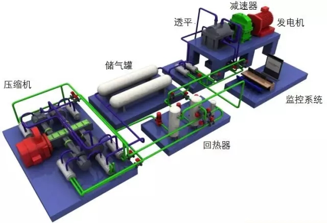 一套完整的壓空系統(tǒng)五大關(guān)鍵設(shè)備組成:由壓縮機、儲氣罐、回?zé)崞?、膨脹機以及發(fā)電機,結(jié)構(gòu)詳圖如下。