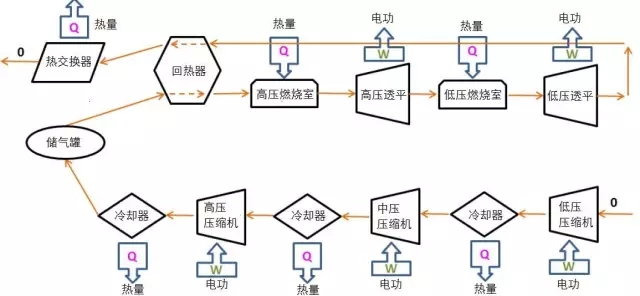現(xiàn)在的問題來了,能不能只使用一臺壓縮機,比如從1個大氣壓直接壓縮到100個atm?膨脹過程從40個atm膨脹到1atm?我可以負責(zé)任的告訴你,理論上可以,但如果你真敢這么做,保證系統(tǒng)電-電轉(zhuǎn)換效率會低的讓你下不來臺!如何解決這一問題?熱力學(xué)給出的指引是多級壓縮,中間冷卻,可顯著降低壓縮過程中的電力消耗;多級膨脹,中間加熱,可顯著增加膨脹過程中的發(fā)電量,綜合起來,儲電效率必然顯著提高。