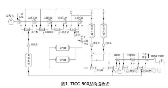 TICC-500的系統(tǒng)流程如圖1所示,系統(tǒng)主要由壓縮子系統(tǒng)、回?zé)嶙酉到y(tǒng)、儲氣子系統(tǒng)、透平發(fā)電子系統(tǒng)等四部分組成。壓縮子系統(tǒng)采用五級間冷活塞式壓縮機(jī),排氣壓力為10MPa,壓縮機(jī)每級的排氣溫度為150℃?;?zé)嶙酉到y(tǒng)由常溫水罐、中溫水罐、高溫水罐、水泵以及換熱器等組成,采用加壓水作為儲熱介質(zhì)。儲氣子系統(tǒng)采用兩個(gè)鋼制壓力儲氣罐,每個(gè)儲氣罐體積為50m3,儲氣總?cè)莘e為100m3。透平發(fā)電子系統(tǒng)包括空氣透平、減速器和發(fā)電機(jī)等??諝馔钙綖橄蛐膹捷S流式,采用三級同軸布置,級間再熱循環(huán),空氣透平的轉(zhuǎn)速為30000轉(zhuǎn)/分鐘,通過減速器將其轉(zhuǎn)速減至1500轉(zhuǎn)/分鐘,帶動發(fā)電機(jī)對外輸出電能。